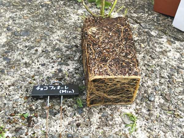 まず2番花の蕾をすべてカットし根鉢の確認を。鉢から抜いてみると根がいい感じに回り、しっかり根鉢ができていました。この根鉢を崩さずに、ひとまわり大きな6号鉢に鉢増しします。