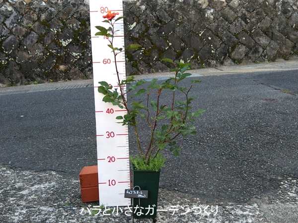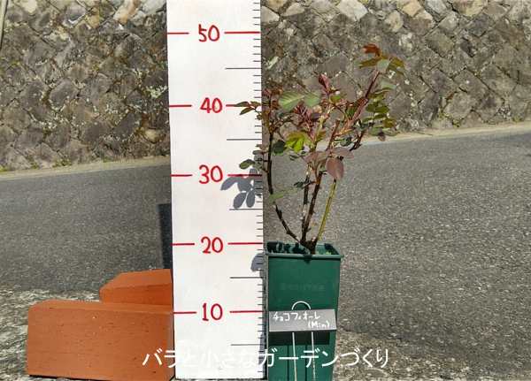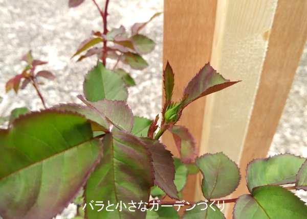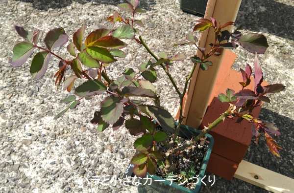 春めいてきて、コンクリートブロックのお日さまが当たるところは、最低気温がだいたい10度、最高気温は今日30度でした。ミニバラは一気に生長しますね。「チョコフィオーレ」が赤みの強い若葉を広げてきました。樹高も前回から10cmほど高くなっています。