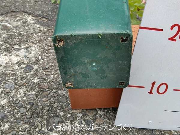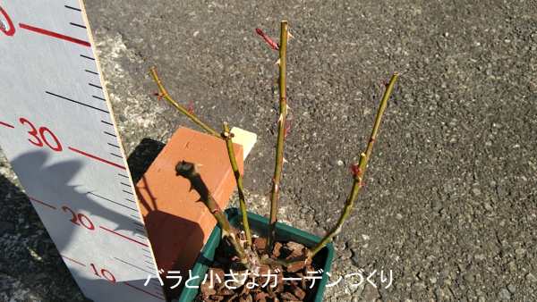 樹高計を作りました。鉢土の高さが18cmなので、そこから上がバラの樹高になります。現在の樹高はぴったり20cmですね。表土にバーク片を敷きました。前回の写真では枝が真っ赤ですが、緑色に変化したようです。