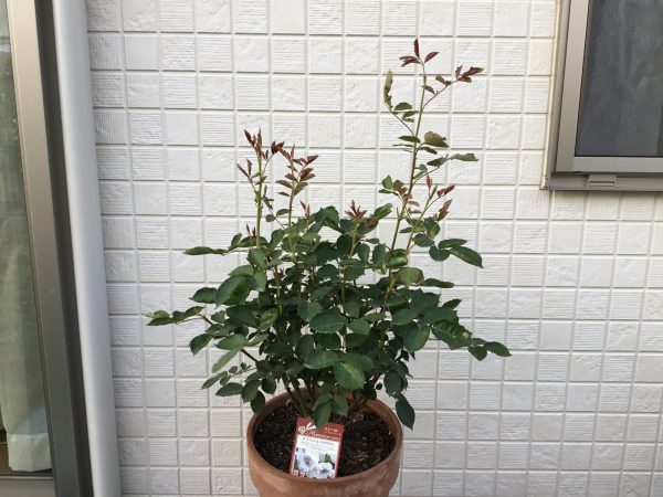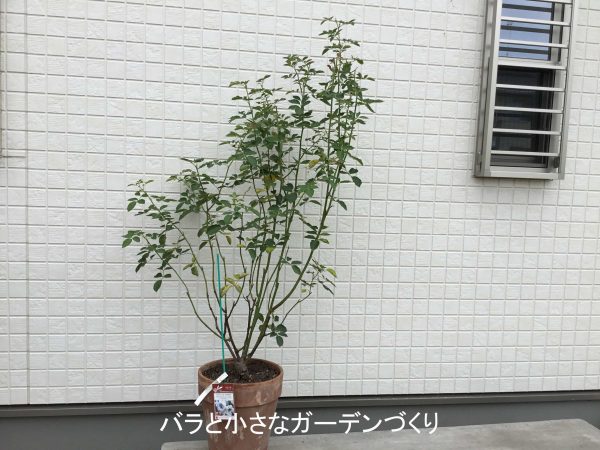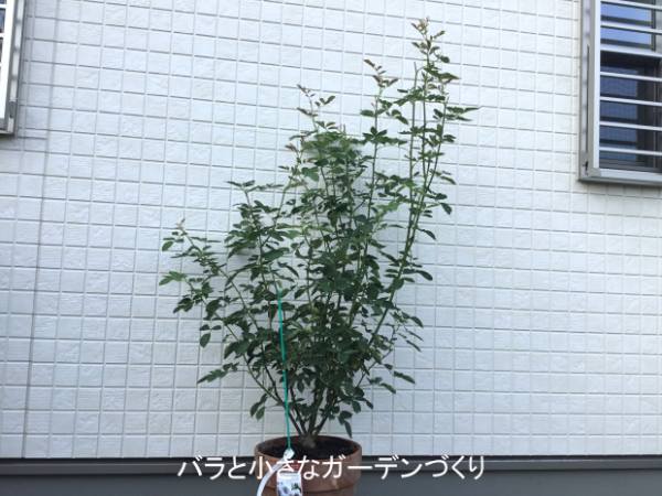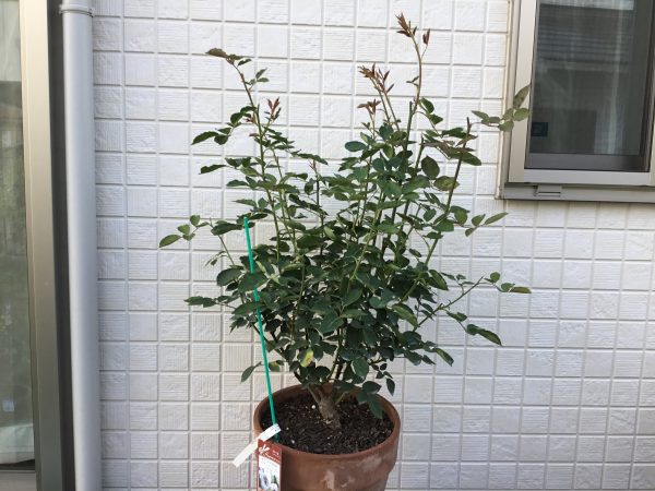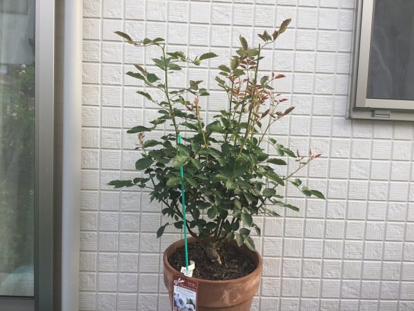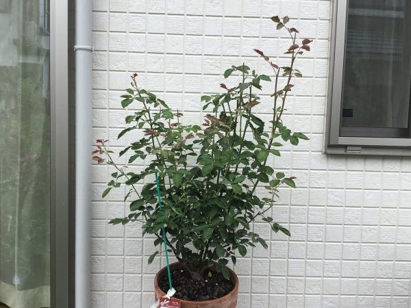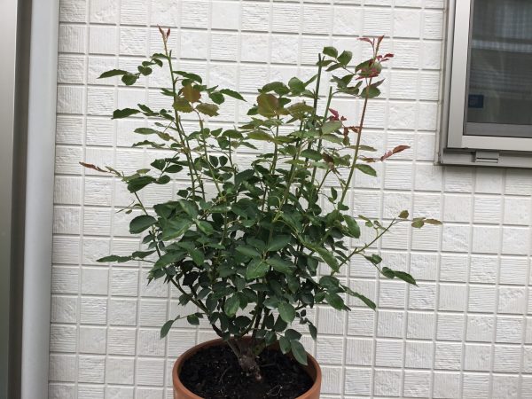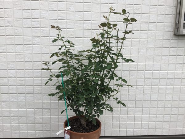 新芽のピンチを続けて「ガブリエル」は、いい感じで生長しています。とても元気です。高いところで樹高60cm。今のところ支柱はいらないですね。意外としっかりとした枝です。混み枝は気にしないで、枝葉を増やします!