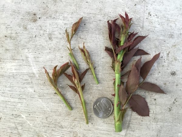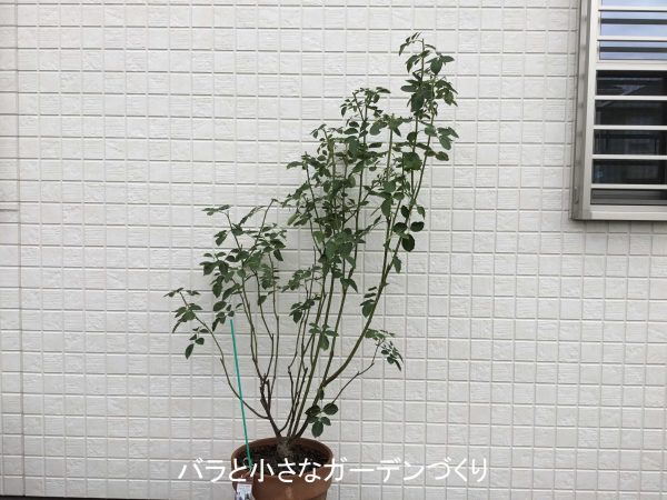 花枝を5枚葉の上まで切り戻して1番花をカットしました。今年は木を育てたいので「ガブリエル」の花は、しばらく一休み。2番花は咲かせません。つぼみが上がってきたら小さいうちにピンチしています。健康優良児が条件ですが、秋花は咲かせたいです。