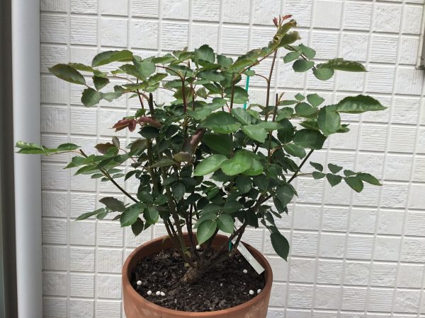 鉢土に腐葉土でマルチングをしました。我が家は鉢植えも庭で管理しているので、これから梅雨の季節に泥はねで黒星病にかかるのを防ぐためです。腐葉土をマルチングに使うことには賛否があるようですが、去年、黒星病に弱い子に施した結果がとても良かったので。マルチングは、高温期に根っこを保護する効果もあります。