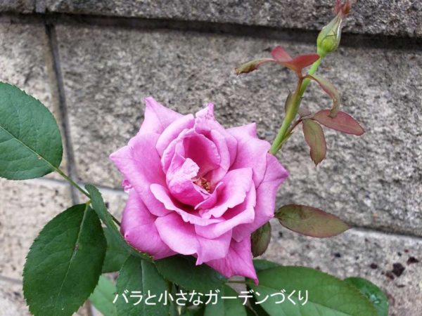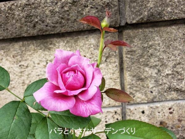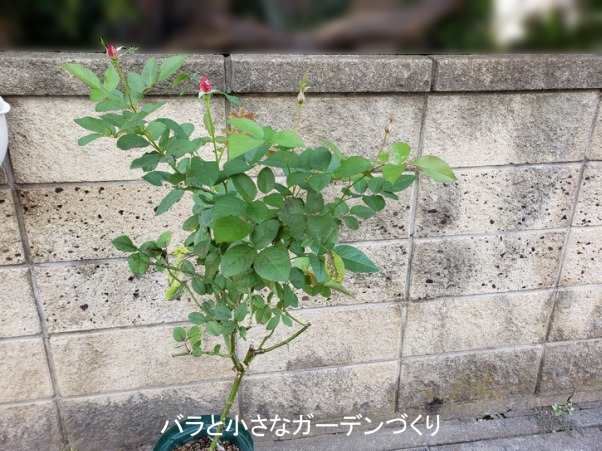 ブルーパフュームは生長が早く、1番花を切り戻したところから伸びた2番花の先につぼみをつけました。現在、樹高は100cm。手前に背の低いバラの鉢を置いているので株元はあまり育っていませんが、全体に調子は良さそうです。