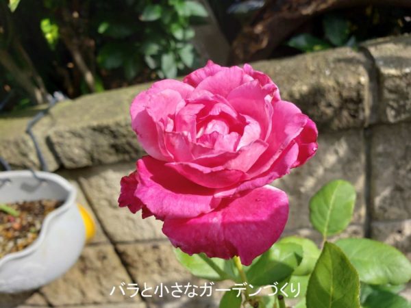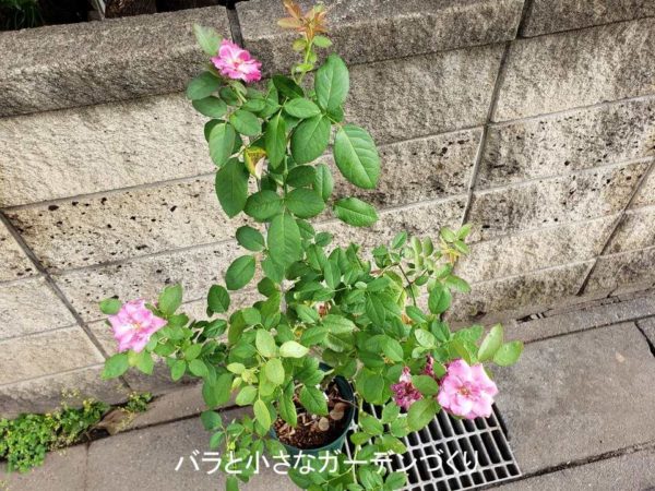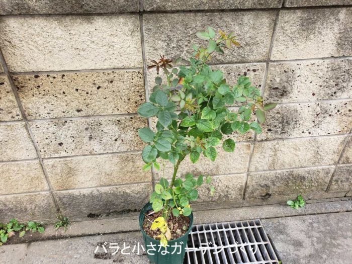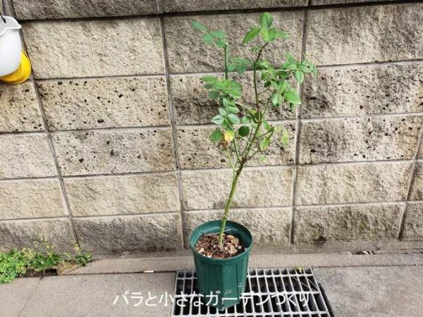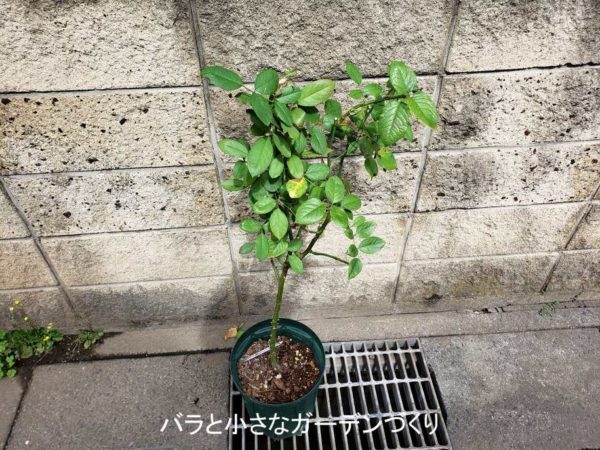さらに次の日の6月30日には、大雨で花が散ってしまいました。かなり枝がのびているので、30cmほど切り戻し、お礼肥えとして「バイオゴールド薔薇」を6号鉢の規定量30粒のところ、少なめの20粒入れました。