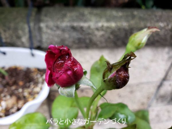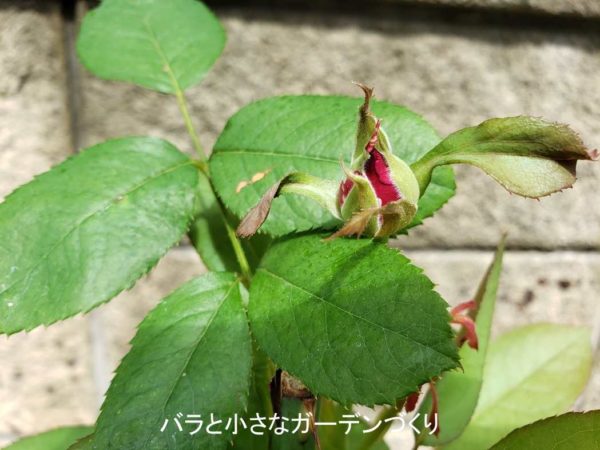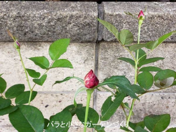 2番花のつぼみには、側蕾もついています。ガクの間から、花びらの色が覗いてきました。「ブルーパフューム」はハイブリッド・ティー系統のバラですが、今回は側蕾を落とさず、これ3輪すべて咲かせようと思います。