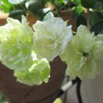 グリーンアイスの枝は細く、30cmほどに長く伸びるので、花の重みで枝垂れるように咲きます。もちろんもっと日照条件の良いところで育てれば、もっとしっかりした枝になりますが、その分、花房も大きくなるので結局、枝垂れるように咲きます。