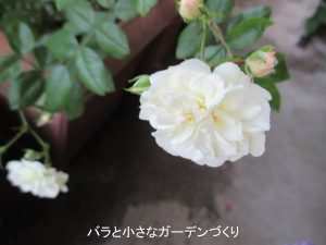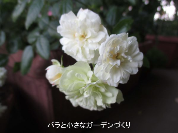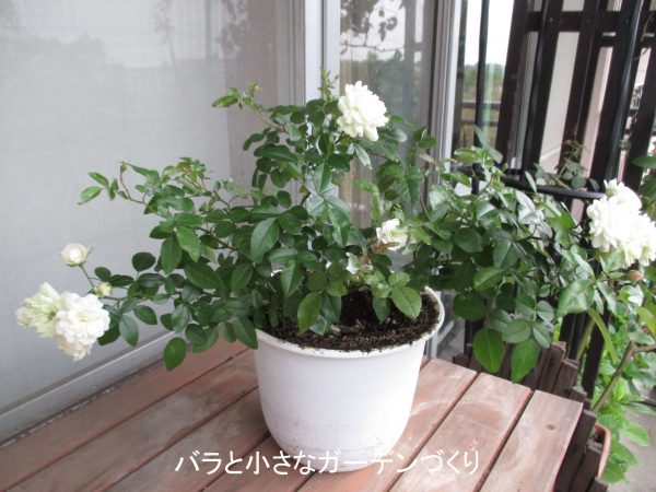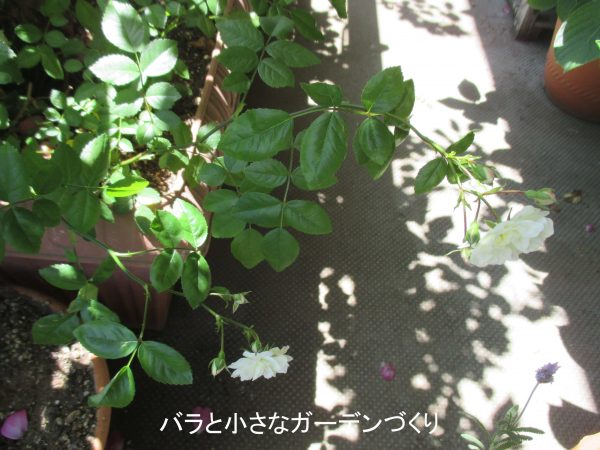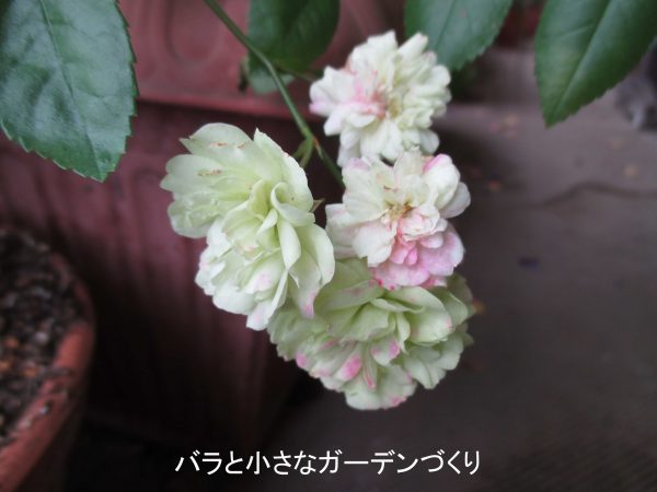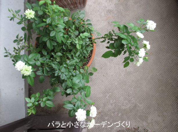 「グリーンアイス」は、とてもすごいミニバラです。上の写真は、春に購入した挿し木苗の8月の様子。この場所もかなり陽ざしのない場所なんですが、ここに置いてニョキニョキとベイサルシュートを伸ばしました。見て分かる通り、シュートの先にばんばん花をつけて、それでも衰えることなくくり返し花をつけ続けたミニバラです。