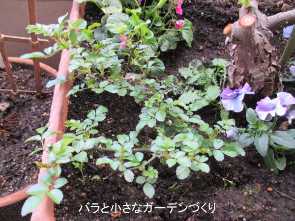 ▲つるバラの株元に、ニオイスミレやパンジーと一緒に寄せ植え
