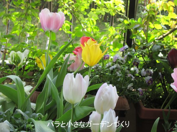 ▲チューリップが花開き、つるバラの若葉が茂ってきた4月中旬・・・