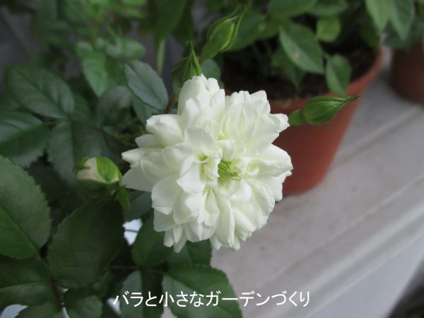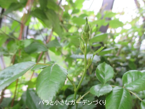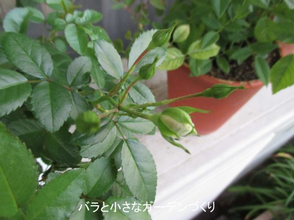 っかり陽当たりのない場所に寄せ植えして、一旦はギブアップしてしまった「グリーンアイス」ですが。その後、単独の鉢に鉢上げして、つぼみピンチを繰り返して木を育てた結果、だいぶ復活してきました。ベイサルシュートはないものの、かなり低い位置から3本のサイドシュートが出て、それぞれに房状につぼみをつけています。
