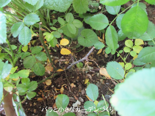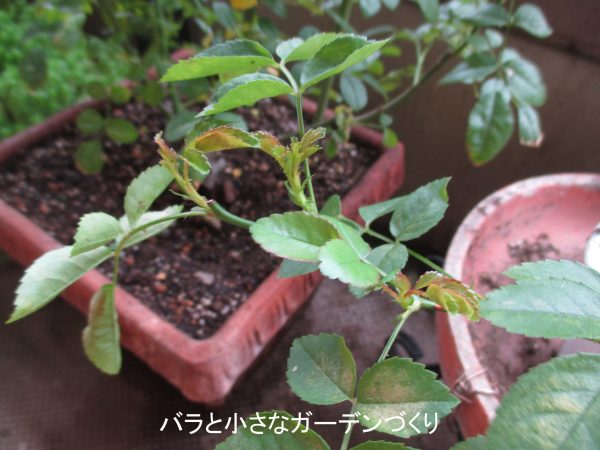 なんと枝先から新芽が伸び始めました。こういうのを見ると、「今は生長期だしもっと短く切って、株の仕立て直ししたいな~」なんて思ってしまうのですが、もうしばらく無理させないで回復につとめようと思います。