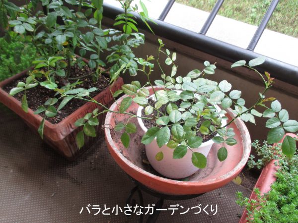 年の春に、つるバラの株元に植えたせいで、十分な日照が得られず半分枯れかけてしまった「グリーンアイス」。春花後に鉢上げし、なんとか秋花を咲かせましたが、ベイサルシュートが出ていません。今年はベイサルシュートを1株あたり2~3本、出してくれたらいいなぁと思いながら、6号鉢に1株ずつ植えました。