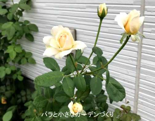 上の写真の右の方に伸びた枝先に夏花が房咲きになっています。淡いクリーム色で、あまりカーブのない花びらで、これだけ見ると別のバラのようです。