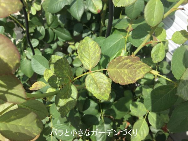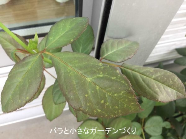 株元の葉に少しだけ黒星病が出ていたので、症状の出ている葉を摘み取り様子を見ています。今のところ広がることはなさそうです。農薬を使わないのは、我が家の地植えのバラにはカマキリが立ち寄ってくれるから。カマキリが来るようになってから、ヨトウムシ被害が目に見えて減りました。