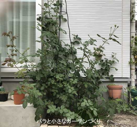 夏剪定をどうしようか迷っていた頃「イングリッシュローズは夏剪定不要」という情報を見つけたので、「ジュードジオブスキュア」は夏剪定なしで行くことにしました。来年は家の壁かトレリスに留めつけて、つるバラのように咲かせたいという思いもあったので。
