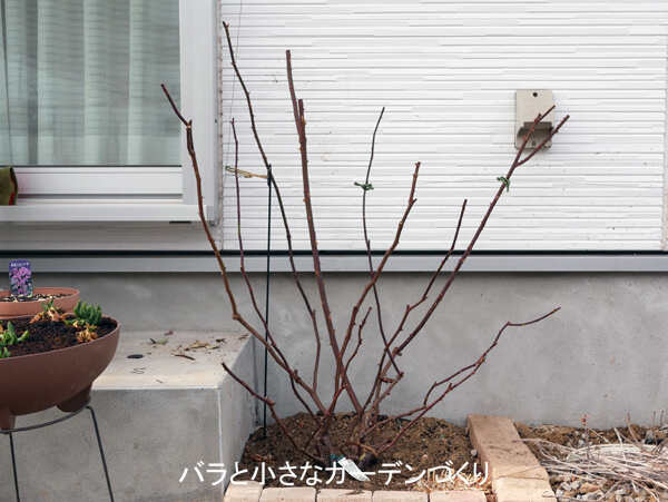 いずれこの株は枝を壁面誘引しようと考えていますが、デビッド・オースチン社のシュラブローズの剪定のしかたを参考にすると、大苗から2年目ではまだ生長途中のようです。今年の壁面誘引は見送り、2/3の高さに弱剪定することにしました。