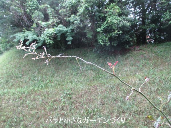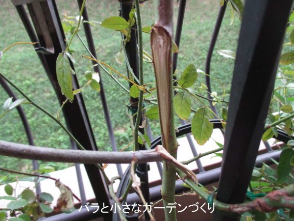 今年のびたベイサルシュートが、自分の枝の重さで弓なりになったところから吹き出すようにたくさんの脇芽が伸びてきました。こういうのを見ると、やはり紅玉はランブラー系つるバラの性質が強いように思えますね。