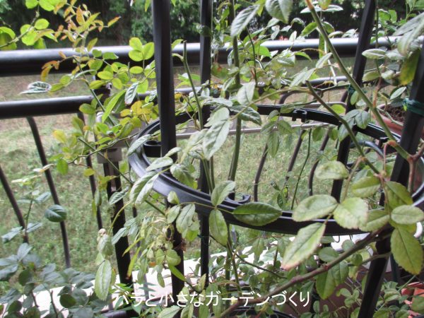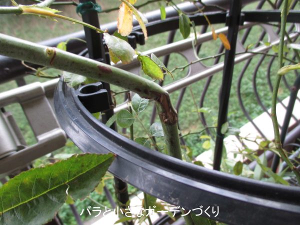 春に出たベイサルシュートのうち1本は、つぼみを持ってしまったので枝先をピンチしてあったのですが、その後新芽が出ず、結局枯れてしまいました。
