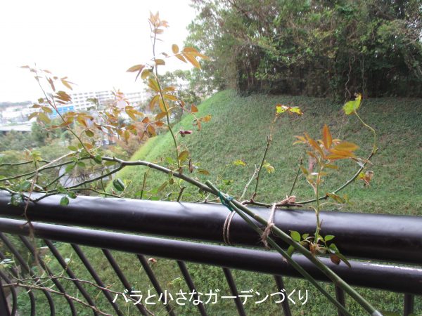 ランブラー系つるバラの花芽ができるのは早く、たとえばモッコウバラでは8月くらいにできます。だからその時期にしっかり水平に誘引することで、花芽をたくさん育てることができます。この紅玉のベイサル・シュートは、誘引するまでもなく横向きに伸びているので、このまま育てます。