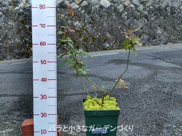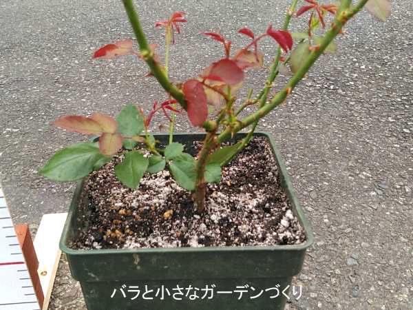 その後、活力剤「HB101」(フローラ)の通常濃度に10分ほどつけてから、8号鉢→6号鉢にサイズダウンして植え付けました。使用培養土は「バラno.1」(カネア)で、元肥なしです。