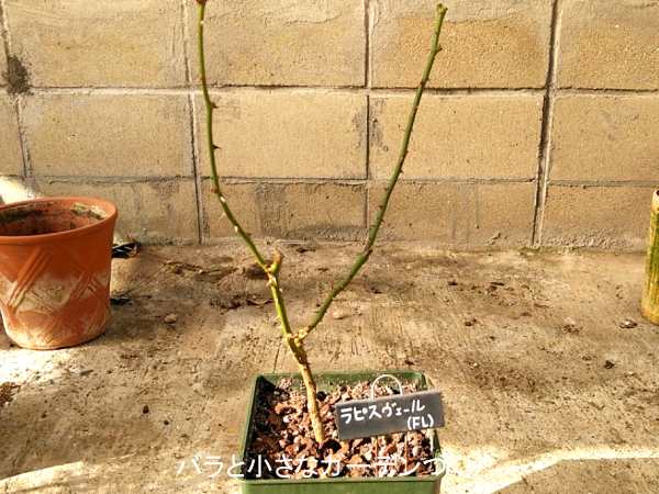 アスタルティさん。こんばんは。そうなんですよ。。。9月にようやく正社員で働き出したのに、お局様の嫌がらせが酷く。。。ストレス発散の為に買ってしまってましたね~ 11月の後半からはうつ病と診断されて12月末から休職。。。社長と話をして。休職のまま、今月末で退職です。明日は診療日なのでうつ病は大丈夫と言ってもらわないと就活が出来ない(笑 おかげで元々の土の入れ替えは順調に12月中にすませました。 ラピスヴェール。僕は画像でしか見た事がないので。 本当にこんな花弁になったら素敵や~ん!でもブルーヘブンにブルーグラビティをすでに予約してたので。。。ま、オリジナルのぼかし肥料付き!についつい。ポチっと。 枝が細いのは、そういう品種かもしれないですね。添え木でもしないとあかんのやろか? バラでも大輪で枝が細いと花が下を向いてしまう品種。。。花が下を向くのは嫌いなもんで。 太い枝を作れるようにしたいと思います。 やっぱ1番花が最高ですよね。 それを確認したら。剪定ですね。もちろん花芽は小さいのはどんどんピンチしてますけど。 バラの家さんのHPでバラ専用の支柱まであるんや。と先日。初めて知りました。広がるのをまとめたりしたりもするのに使ったりするみたいですね。青龍も細かったので、普通のあの緑の支柱に結ばれてやってきましたね。 今。支柱にしてるのは。冬に購入したミニバラのヒョロ苗さんたち。割り箸ですが(笑 1本の枝にきちんと花や蕾がついて、根っこは数本ヒョロっと。。。 生命の力?園芸屋さんの力?凄いですね。挿し木で数本の根っこに花を咲かせるんですから。 ヒョロ苗さんたちは、花を確認して。速攻。花に蕾は切って。少ししたら。解体して。植え直しました。あの小さい鉢に4~6本。成長したら。完全に密になりすぎますからね。それにしても接ぎ木のミニバラの高い事!! 正直。躊躇しましたね。ミニバラは青系、ブラウン系、白系、そして緑系で色々と購入しました。 なんたってメインを青系のバラ。でもう~っすい色なので。足下にミニバラでグレーのような青系を引き立てようかな?って考えです。ヒョロ苗さんたちも解体したけど。まだ1本も枯れずに育ってる最中です。接ぎ木苗は、冬の剪定に鉢増しも終わってる状態でしたのでそのまんまです。 ず~っとサービス業ばかりしてきたのでコロナで正社員は、ほとんど無いですね。しかも53歳のおっちゃんやし(笑 保険付きのパートさえない。。。 ま、バイトでもしばらく仕方ないか。もう。買う物はほとんど購入したので。リビング予定の部屋に大型液晶TV。ま、誰も来ないし。いつでもいいや。 でもコロナで失業期間も長かったので。日付が入った時計に全て変えましたね。 何もしていないと、あれ?何日だ??? 昨年はミニドッグランを作って。この冬は、なんちゃって花壇風にレンガを置いて。他にも花や木もあるので。ミニドッグランに。ある程度、移動させないと。今、思案中です。わんこが走り回るので。しっかりした台座か棚?作らないと!!うつ病はもう、大丈夫そうなので。風がなく、天気がいい日にはバラの鉢をお日様に極力、当てるようにしてます。で。。。寒気団が来る時には全て、ミニドッグランへ避難(笑 理屈はよく分からないのですが。植物には朝日が一番大切と生花店では教わりました。 光の波長の具合でしょうね。難しい花の品種には西日は避けてください。ってのもありますから。一度だけ切り花のバラ農園さんを見学に行きましたが、ハウス栽培ですが、あのガラス。品種ごとにガラスの種類を変えてるそうです。 一番。難しいのは黄色のバラがガラスの加減が難しいとおっしゃってました。ちなみに大阪の大手の生花店でバイトしてた時は。国産のバラは全て棘は指で1つづつ取ってました。葉っぱも切狭で。輸入の安いのは棘・葉っぱ取りので一気にやってたんですけどね~ やはり枝にキズが付くので。国産のバラは高いので。あれは大変でした。ま、デパートにもたいていテナントで入ってたのもあるので、手入れに関しては凄く厳しかったですね。 ラピスヴェール。1本だけヒョロ~っと枝が長いので。近々。樹形を想像して切る予定です。花がない状態で届いたので。1番花。楽しみ!!