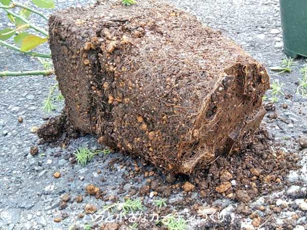 土替えのため鉢から抜いてみると、「ラピスヴェール」の根張りはよくありませんでした。