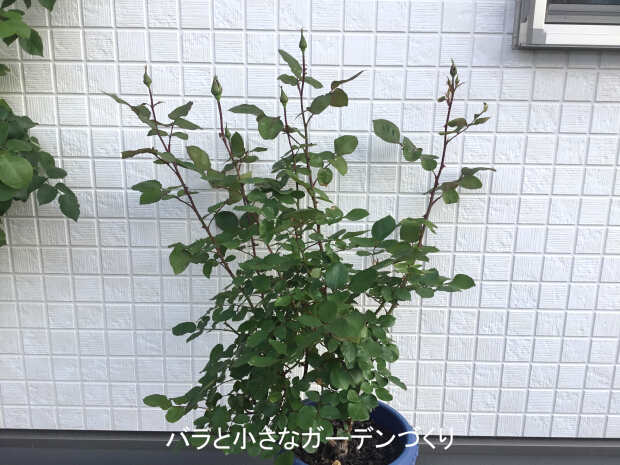 ベルサイユのばらが、ようやく蕾を上げました。とりあえず5個、確認できます。この子は遅咲きです。