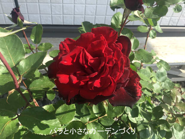 ベルサイユのばらが満開になりました。全開した花径は13cm。ゆるくウエーブのかかったまる弁の、やや黒味のゆうゆうとした大輪花になりました。存在感バツグンです。