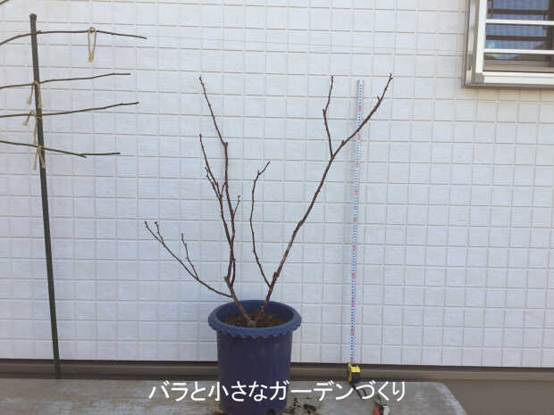 半分以下の樹高40cmまで強剪定しました。枝数はすべてキープしています。今年は真紅の巨大輪を咲かせたいですね。