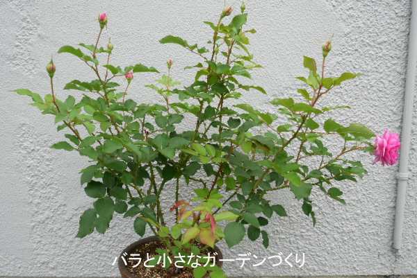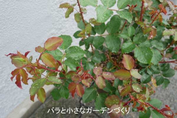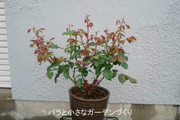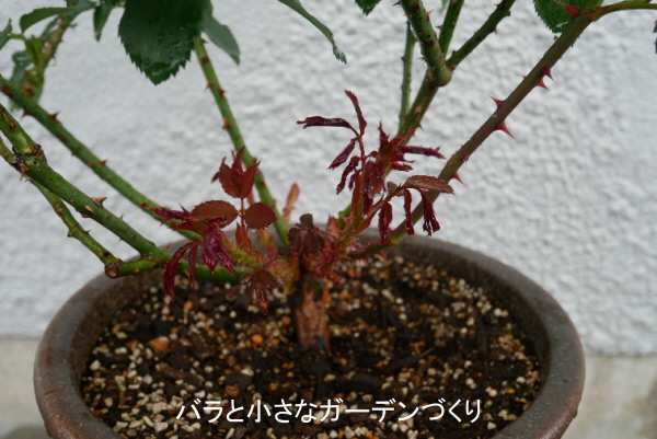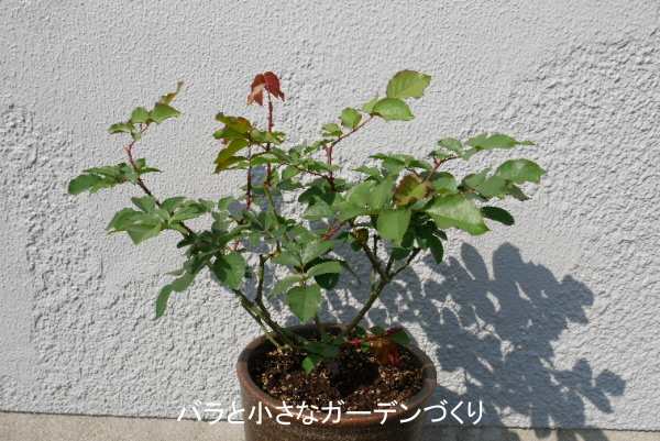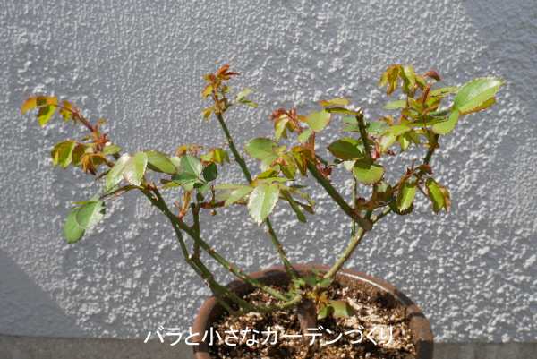 「マイローズ殺菌スプレー」(住友化学園芸)で、新芽中心に消毒をしました。水やりは、1回1リットルを週2回くらいあげていますが、若葉が展開すれば回数を増やします。