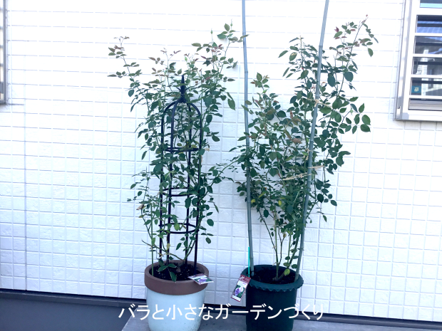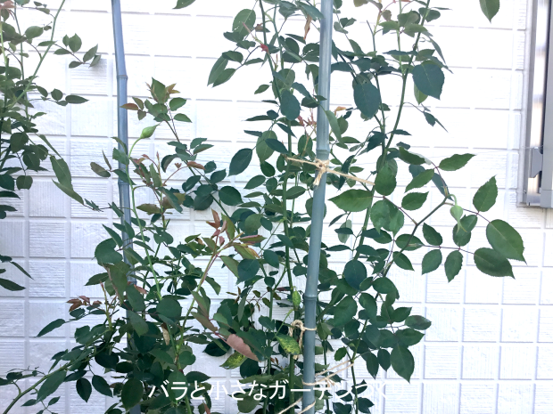 樹高110cmのルシファーB。支柱を立て、軽くくくりつけています。こちらも黒星病にかかりましたが、薬剤集中散布のかいあって軽微のうちに治りました。こちらも元気なので咲かせてみたくなりますが、来年までおあずけです。