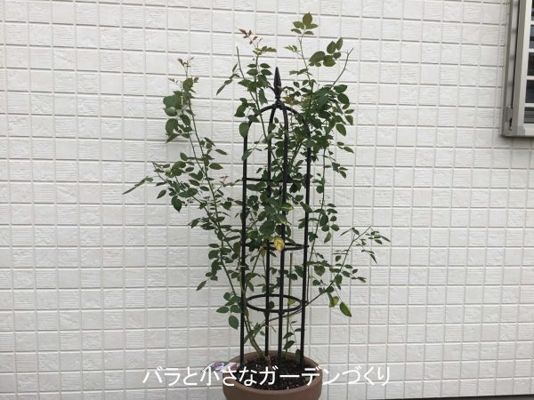 オベリスクを支柱がわりに、横に広がらないように管理している「ルシファーA」。たくさんのつぼみが上がっています。咲くのが楽しみです。