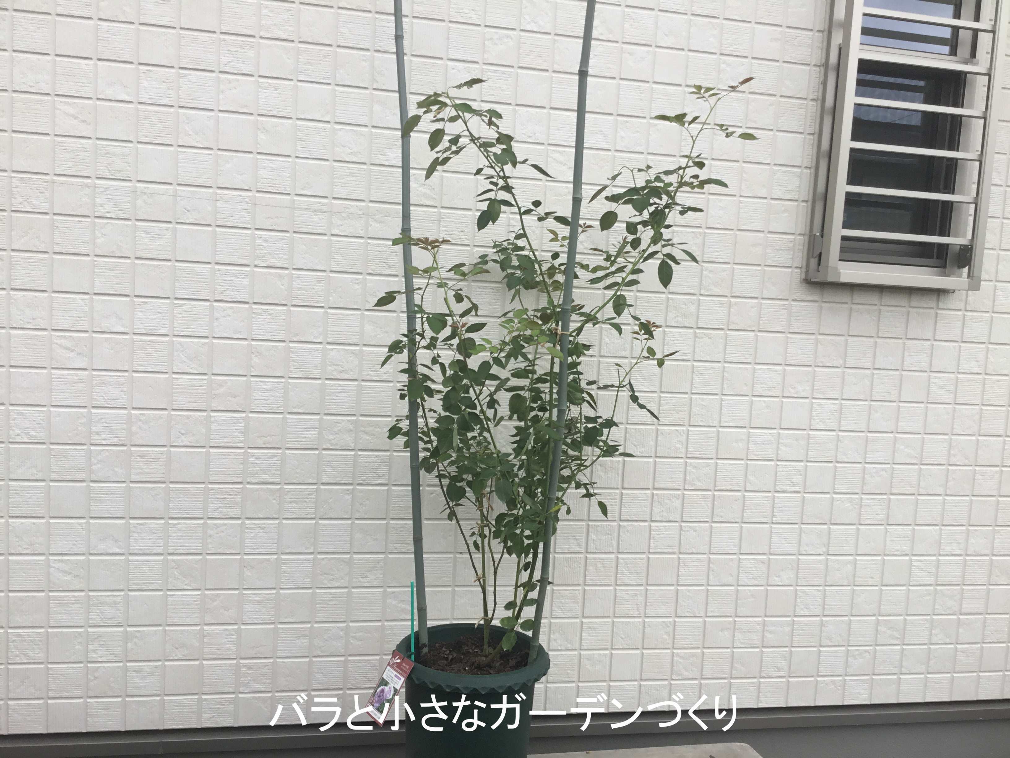 樹高110cmのルシファーB。支柱を立て、軽くくくりつけています。こちらも黒星病にかかりましたが、薬剤集中散布のかいあって軽微のうちに治りました。こちらも元気なので咲かせてみたくなりますが、来年までおあずけです。