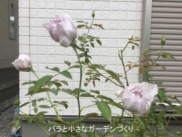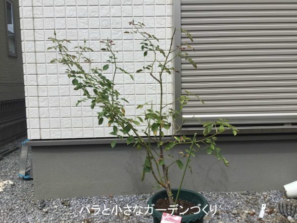 ルシファーAの枝先に3輪開花しています。若い枝先のみ生長していて、他は沈黙しています。樹高120cm。