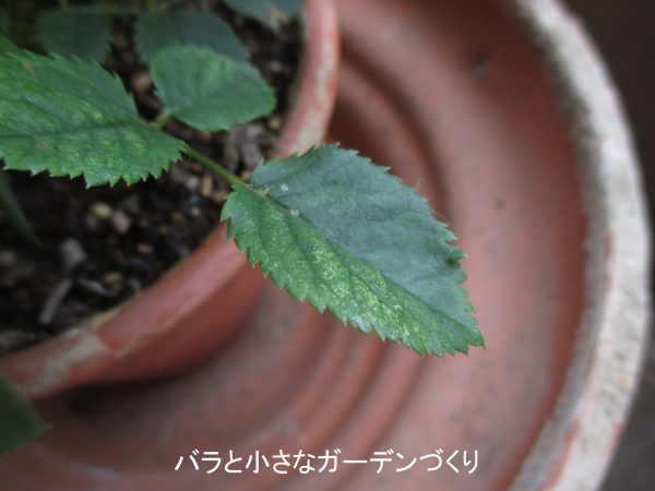 若葉に少しウドンコ病が発生しています。中央に写っている大きなつぼみもウドンコ病で真っ白になってしまっていますが、もうしばらくしたら咲いてくるでしょう。