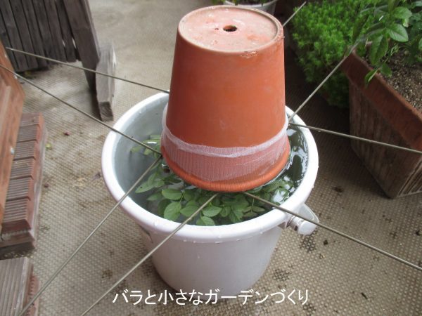 要領は「レッドインフィニティ」のときと同じです。鉢の下から底を切った排水溝用水切りネットを履かせ、満タンに水を張ったバケツに逆さに漬けて1時間。鉢を支える棒は3本か4本ですが、3本の方がやりやすかったです。