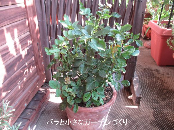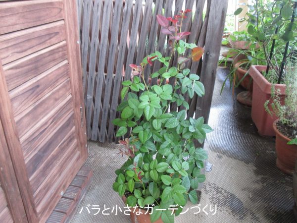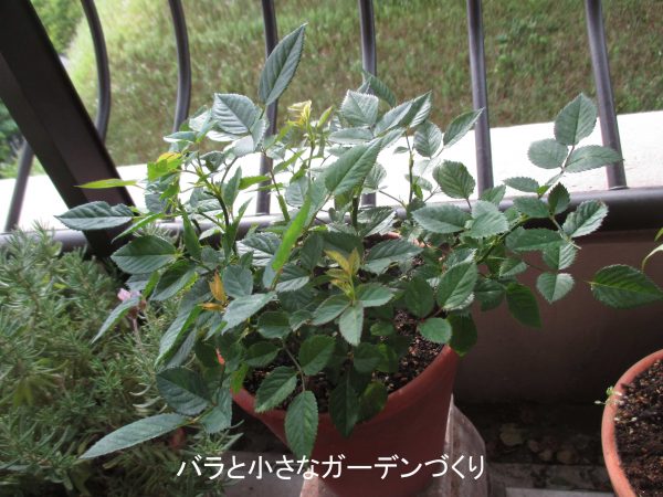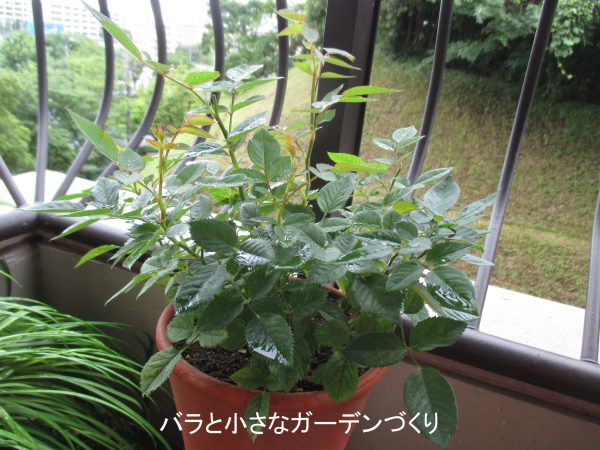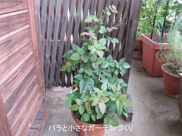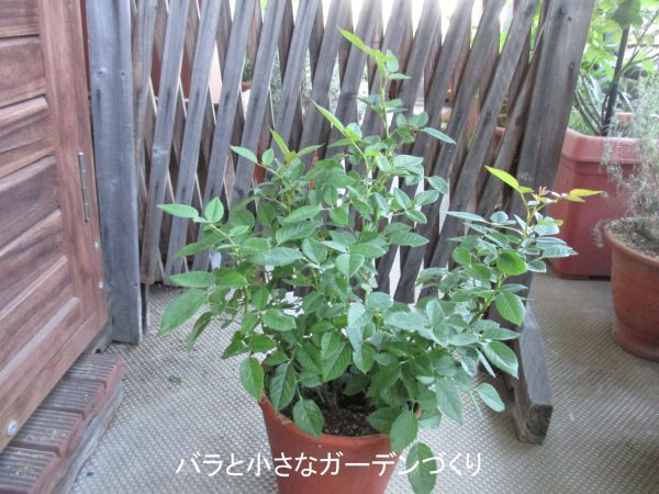 フォーエバーローズの「ナポリ」は、相変わらず調子が良さそうです。伸びたベイサルシュートの先をピンチし、ピンチしたところからさらに芽が伸びてきています。樹高は30cm。頻繁につぼみがつくので、どんどん取り除いています。