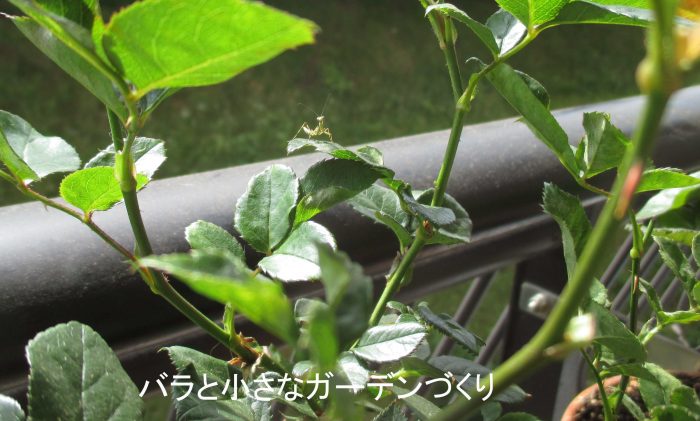 さいきん他のバラでときどき妙なことが起きていたんです。クシヒゲハバチの幼虫の食害痕があるのに、葉の裏に何もいない・・・。あれ? ってことが増えていて、不思議に思っていたら、その犯人というか、生物兵器を「ナポリ」の上に発見しました。カマキリの子どもですね。どこかから飛んできたようです^^