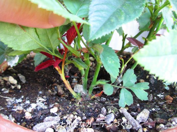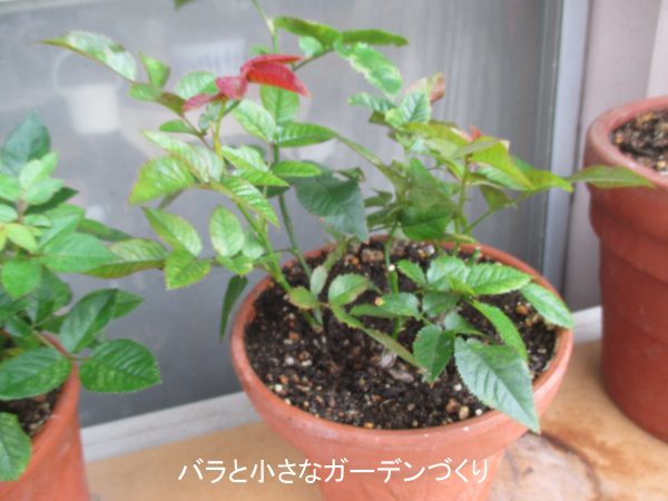 4本ある挿し木苗のうち、1本は問題なく生長していて、残り3本からブラインドにならずに新芽が伸びてきました。なんとか、このまま育ってほしいものです。でも、じつは「どぶ漬け」の手際が悪くて1本の貴重な新芽を落としてしまい・・・。レッド・インフィニティは受難続きです。