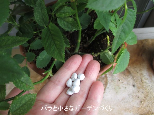 9月4日。夏剪定前の追肥です。今回、追肥に使用したのは、「IBのチカラ」(花ごころ)(N10P10K10+Mg1)です。効果が続く期間は約1ヵ月。5~6号鉢で10粒と表示されていますが、まだ本調子ではない株もあるので、控えめの6粒にしました。