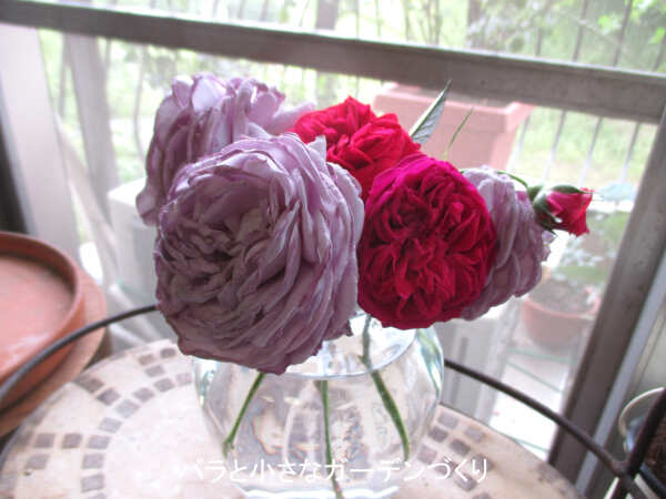 切り戻したノヴァーリスとローズがかった黒赤のバラを組み合わせると、意外とキレイで気に入りました。