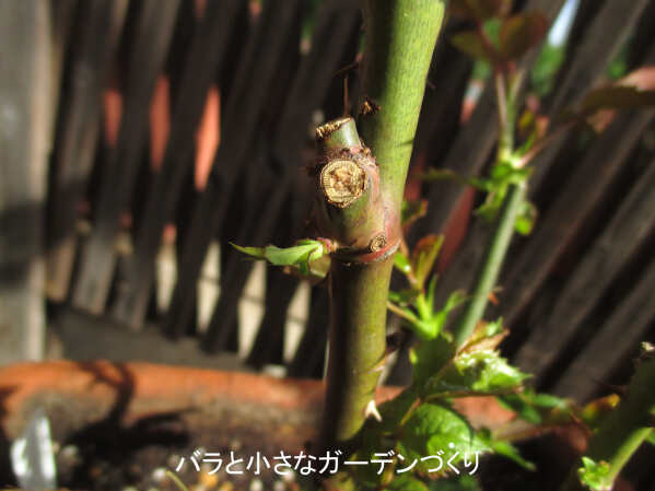 絡み枝を切り取ったところからも発芽してきました。横向きについているので、今度は絡み枝にならないかな。