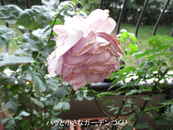咲いてから2日しかたっていないのに、花びらの先がしんなり・・・水切れさせたかなぁ? それとも雨続きのせいか。他のバラたちも、雨で傷みが早いです。