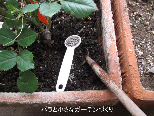 バラ1株あたり5~10g使用ということなので、小さいめのティースプーン(正確にはアイスクリームのスプーンです)に2杯、おそらく8gていどを株元に散布しました。