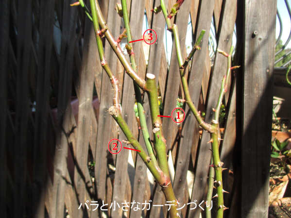 2月に入り、天気の良い日は暖かくなってきたのにつれ、バラの新芽も伸びてきました。「ノヴァーリス」は、すべての枝からしっかり芽吹いています。
