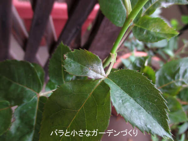 ウドンコ病の発生は、ごくわずかです。「ベニカXガード」のウドンコ病への効果を確認するため、この株には「重曹オイルスプレー」を散布していません。が、周りのバラにウドンコ病がなくなったので、以前よりかかりにくい環境になっていると思います。