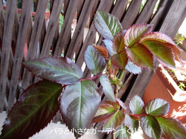 前回1番花を切り戻したところから、赤い新芽が伸びてきました。やがて枝先に2番花の蕾がつくでしょう。