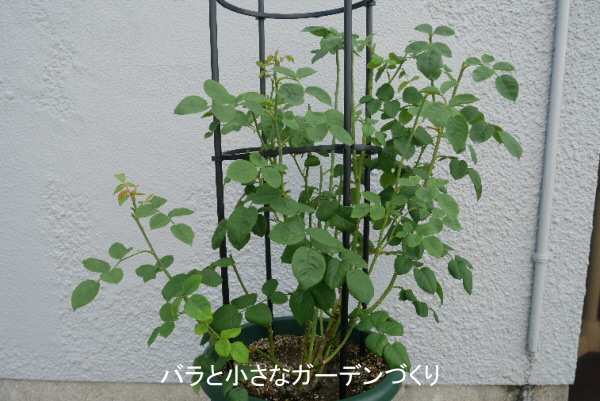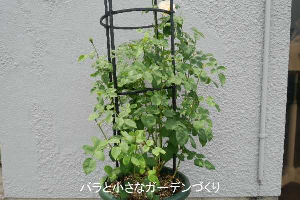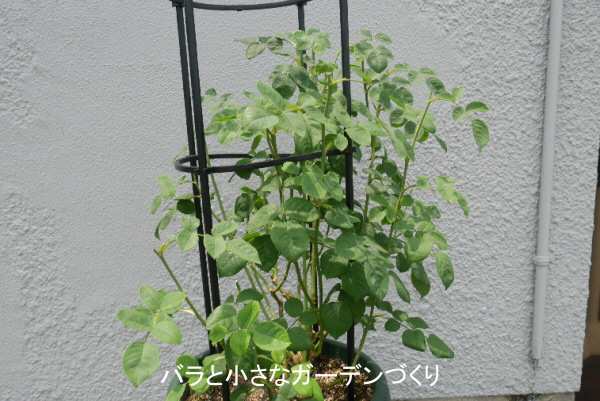 「ナイ・ベヴァン」をお迎えしたのは昨年10月末です。お迎えしてすぐにデビッド・オースチン社の鉢から12号プラ鉢に植え替えし、オベリスクを立てました。強風に弱そうなので、軽く巻き付けておきます。少しだけ黒星病が発生したので、病葉を取り除き、軽く「ベニカXネクストスプレー」(住友化学園芸)を散布しました。