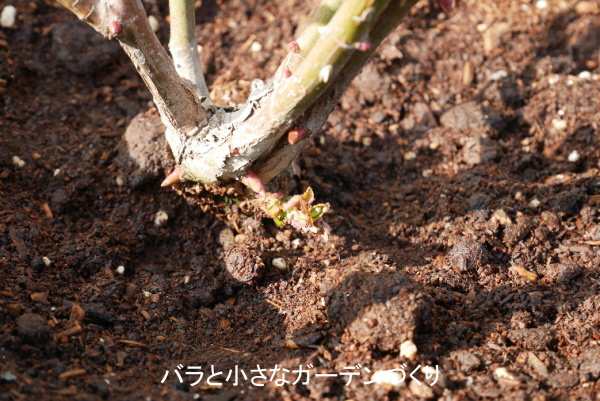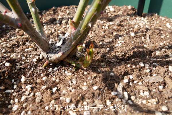 3/15 芽出し肥の施肥。「ユーキリン(リン酸肥料/相原バラ園)+ミラクル(骨粉肥料/相原バラ園)」を、それぞれ一掴みずつ株の周囲に撒きました。
