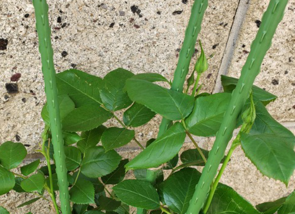花枝が伸びて広がってきたので、支柱を立て麻紐で結びました。支柱はダイソーで長さ75cmのものを購入。